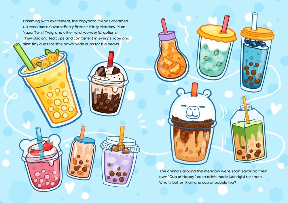 —Kirkus Reviews“In this fun book about creativity and experimentation, three cute capybaras learn to make ‘a cup of happy.’ The friends mix up batch after batch of bubble tea, trying different methods and ingredients in their quest for the perfect taste and texture. When new friends have different ideas about what tastes good, the capybaras keep working, eventually dreaming up lots of flavors and textures. They even craft cups in different shapes and sizes so friends can enjoy the treat no matter the size or shape of their paws or beaks. This terrific book shows the power of problem-solving and inventiveness. A bonus is that kids who don’t know of bubble tea will discover a new treat—with the included kid-friendly (caffeine-free) recipe. I highly recommend this book.”