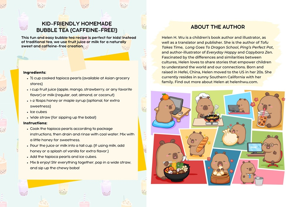 —Carol Doeringer, author of If You Wake a Skunk“Filled with vibrant colors, happy capybaras, and an adventure to figure out bubble tea, this picture book is a delight to read. I enjoyed learning more about bubble tea and the wide variety of different bubble teas and animals included in the story. The recipe and additional bubble tea information included in the back matter is perfect for this story.”