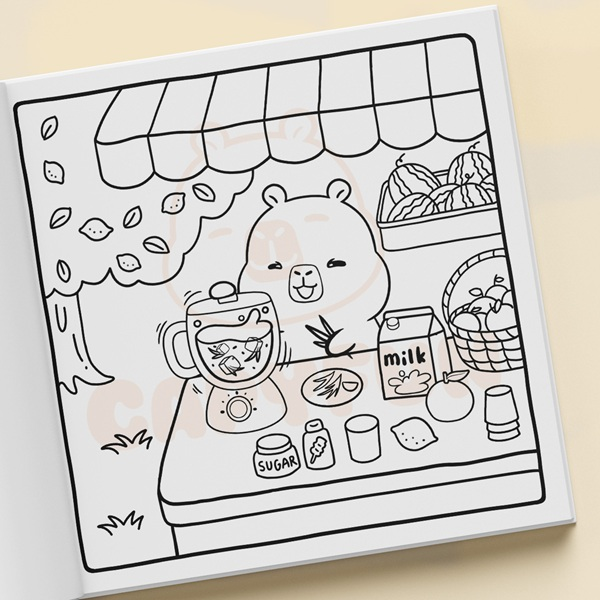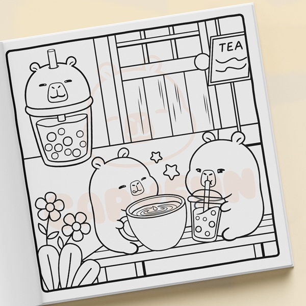 A whimsical capybara bubble tea coloring book with 40 single-sided pages relax, color, and savor simple joys one boba at a time.